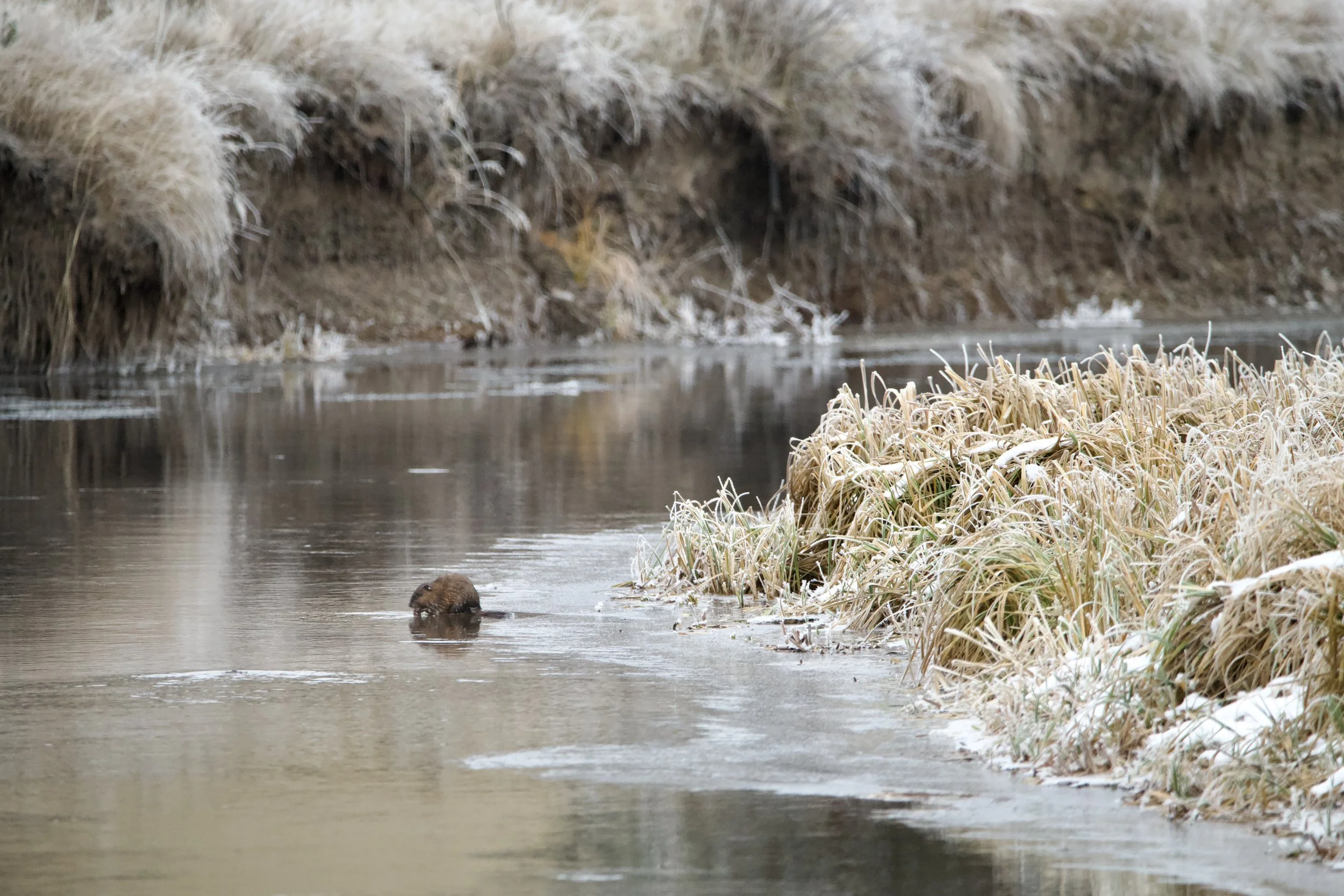 While cooking our Thanksgiving Quiche, I noticed something black on the river. Without my glasses, I couldn’t make out much detail. The scope revealed a beaver (or muskrat, the tail was not visible enough to discern), which drew me out in the cold with my camera for a closer look.